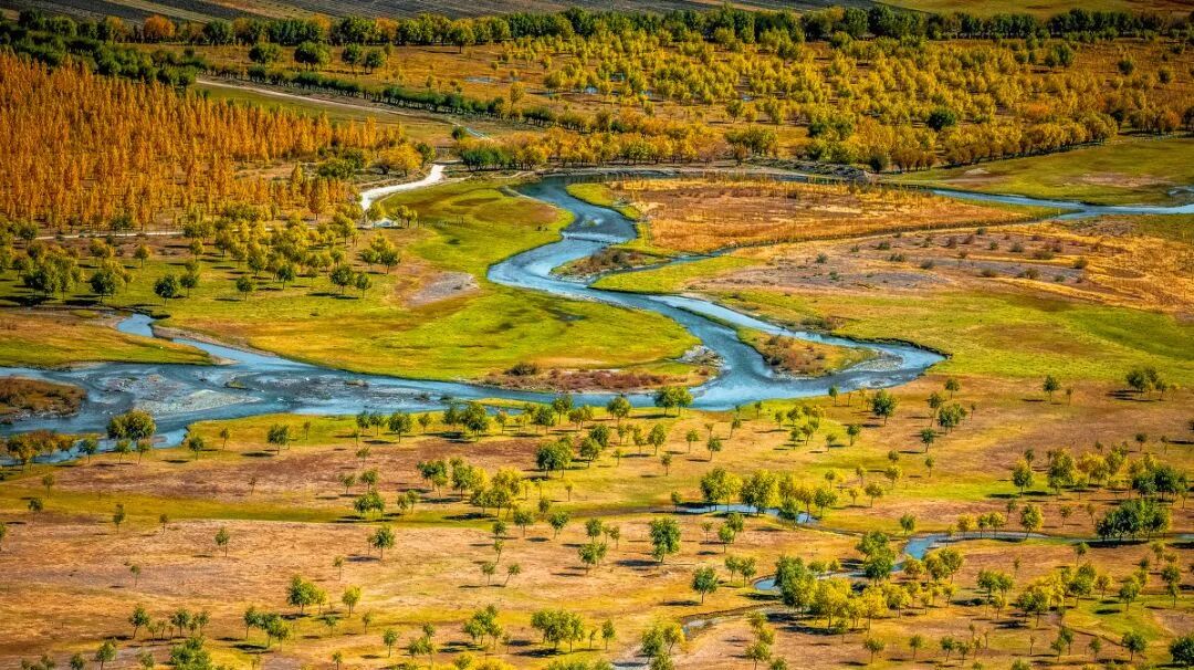 从空中俯瞰,江水仿佛静止了一般任由天空和大地在水面上肆意泼墨作画。