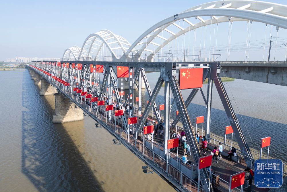 ↑ 10月1日,游客在哈尔滨市滨州铁路桥上游览。新华社记者 张涛 摄