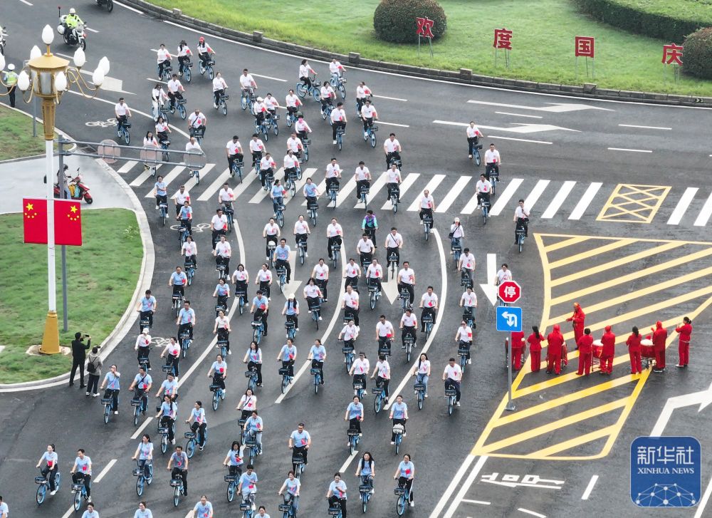 ↑ 10月1日,江苏省淮安市盱眙县举行“共贺祖国华诞”绿色骑行活动,参与者骑车出发。新华社记者 季春鹏 摄