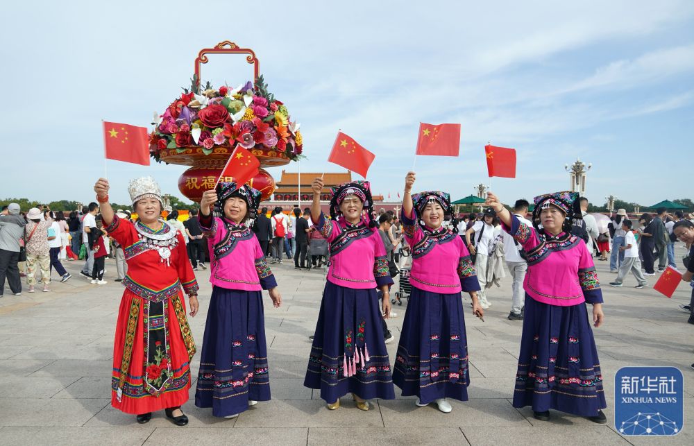 ↑ 10月1日,来自贵州的布依族游客在北京天安门广场游览拍照。新华社发(梁志强摄)