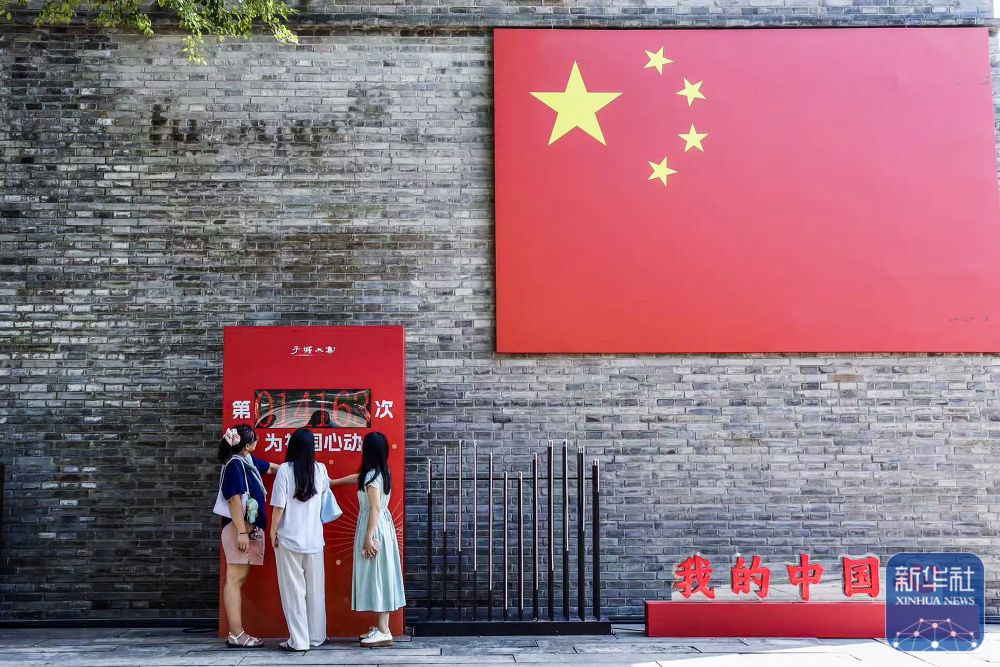 ↑ 10月1日,在浙江嘉兴市南湖区建设街道子城城墙边,市民与国旗合影。新华社记者 徐昱 摄
