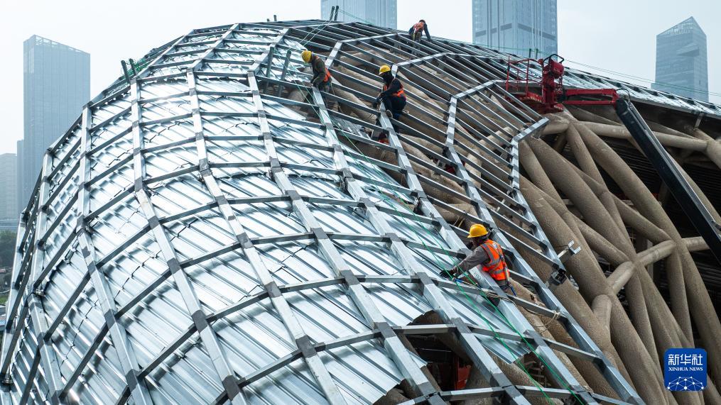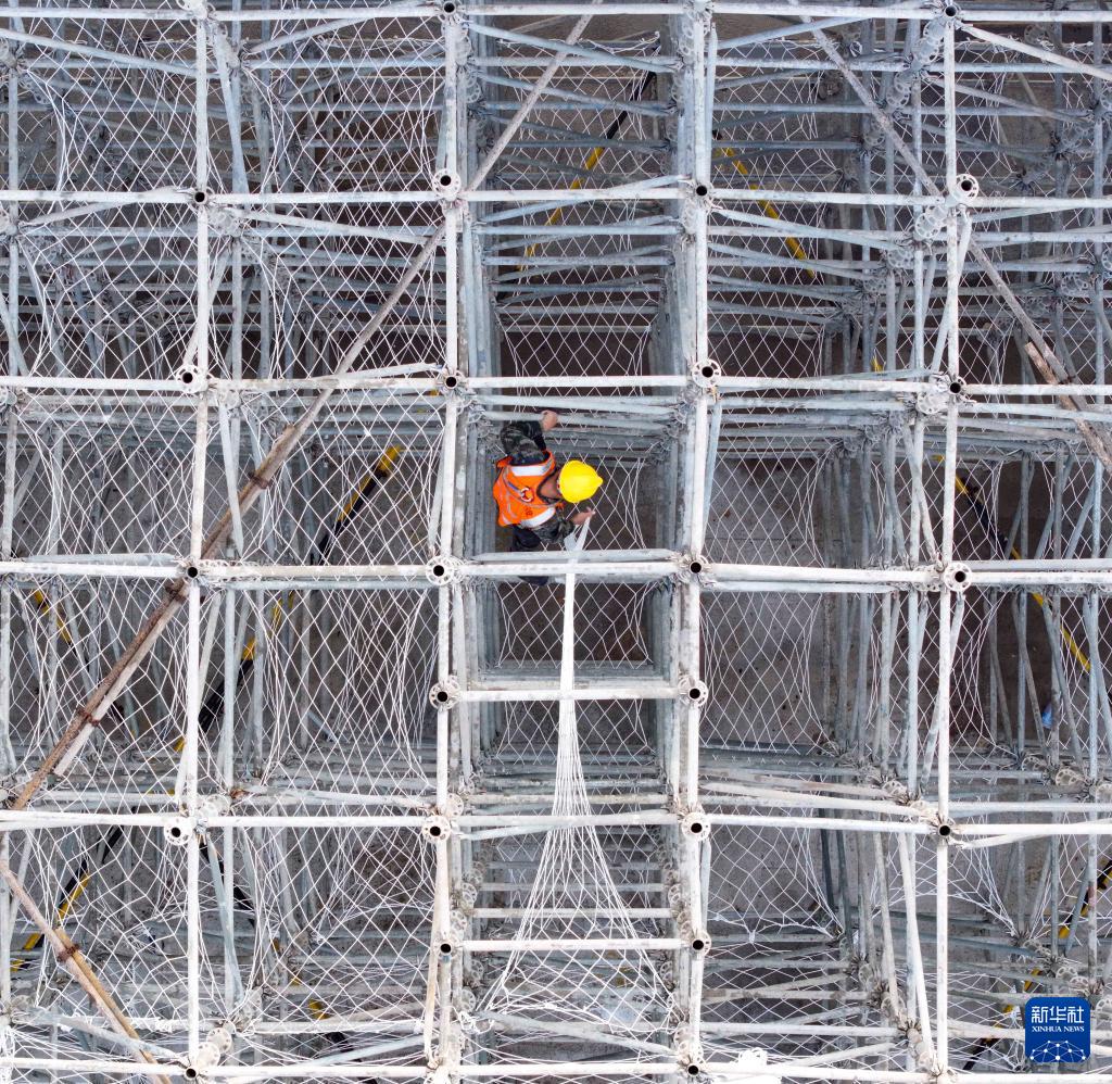 10月1日,工人在江苏省泰州市高铁南站综合交通枢纽一项目为井字架安装防护网(无人机照片)。