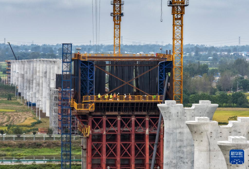 10月1日,中铁十局工人在合武高铁一标庐安特大桥跨淠河总干渠连续梁拱施工现场作业(无人机照片)。