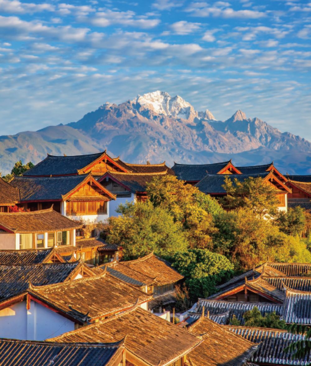 清晨的丽江古城和玉龙雪山。