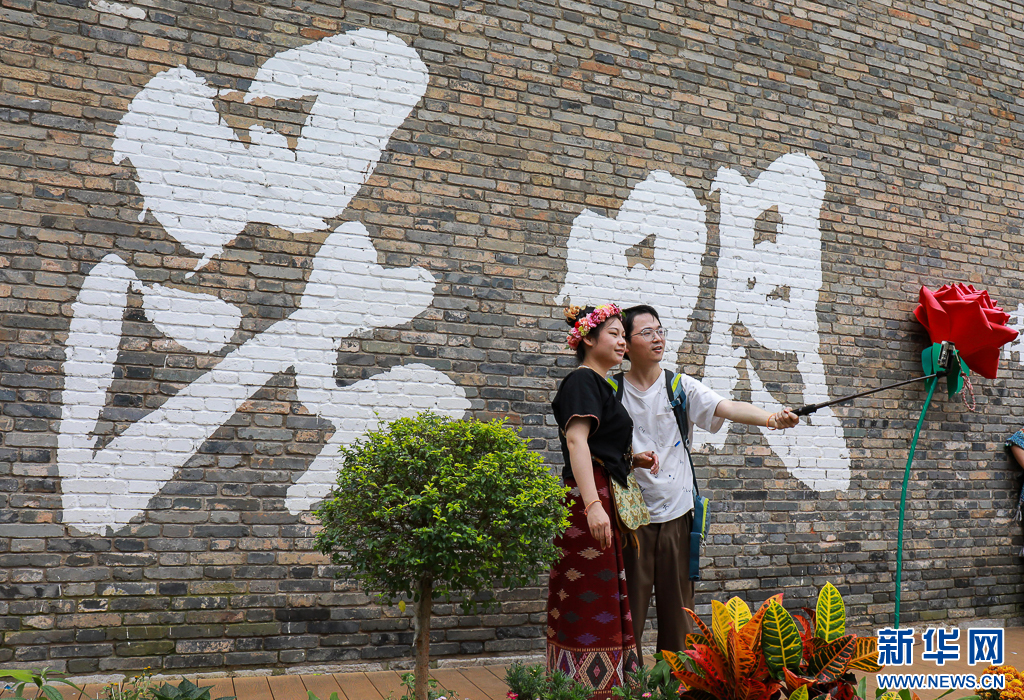 游客在昆明老街网红打卡墙拍照(10月4日摄)。郑益/摄