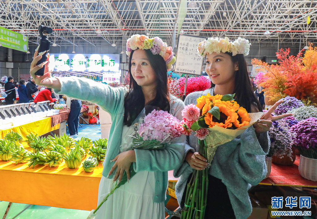 游客在昆明斗南花卉市场拍照打卡(10月1日摄)。郑益/摄