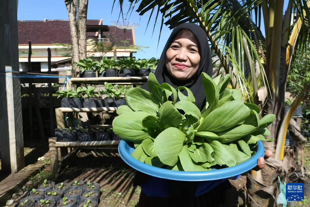 2025年10月4日,印度尼西亚南苏门答腊省麻拉埃宁县丹戎拉朗村第三村民小组的卡斯米娜在家中后院展示刚采摘的上海青。新华社记者 叶平凡 摄