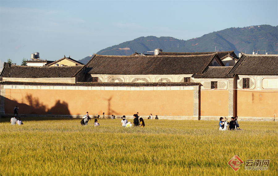 金秋十月,大理喜洲稻田一片金黄引来四方游客