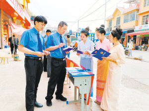 检察干警在磨憨街头开展普法宣传。