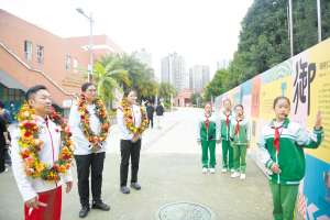 15时,身着云南少数民族服饰和学校礼服的“芳草小使者”仪仗队整齐列队,站在学校门口热情迎接3位奥运冠军的到来。在热烈的欢迎声中,学生们向奚爱华、王娇、郭伟阳献上花环,身着云南少数民族服饰的学生将“民族”与“国际”的校园特色融为一体。