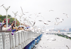 图为11月2日,游客在海埂大坝观鸥、喂食。新华社文/图