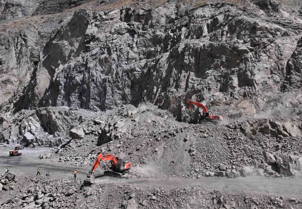 工人在塔吉克斯坦卡拉依洪姆村附近的中塔公路二期工程1号隧道施工现场工作。