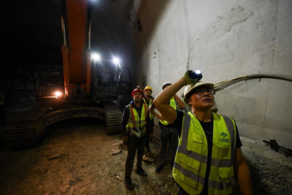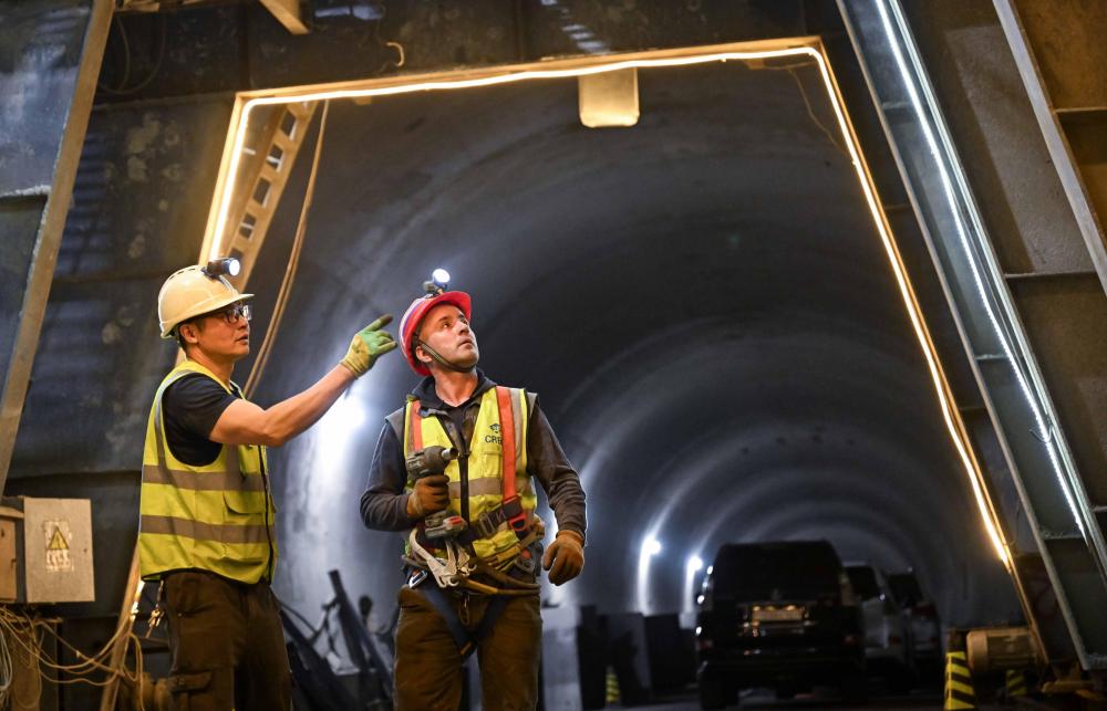 一名中方员工(左)在塔吉克斯坦卡拉依洪姆村附近的中塔公路二期工程1号隧道施工现场指导塔方员工。