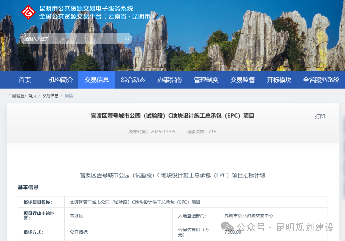 11月5日,昆明巫家坝建设发展有限责任公司在昆明市公共资源交易中心网站发布了官渡区壹号城市公园(试验段)C地块设计施工总承包(EPC)项目,估算总投资7300万元。