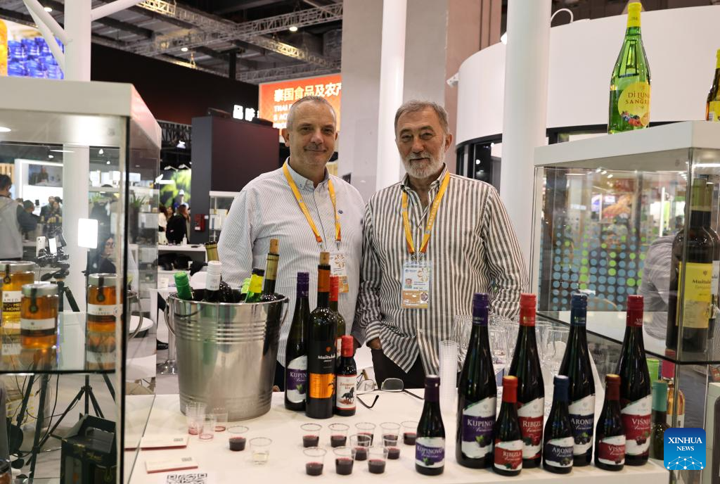 This photo shows bottles of wine from Serbia at the Food and Agricultural Products exhibition area during the eighth China International Import Expo in east China's Shanghai, Nov. 7, 2025. The eighth CIIE opened here on Wednesday. Enterprises from a total of 123 Belt and Road partner countries participated in this year's CIIE, increasing by 23.1 percent year on year. (Xinhua/Fang Zhe)
