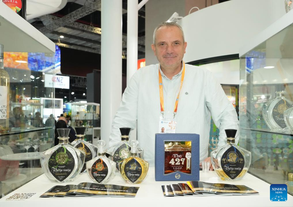 This photo shows bottles of liquor from Serbia at the Food and Agricultural Products exhibition area during the eighth China International Import Expo in east China's Shanghai, Nov. 6, 2025. The eighth CIIE opened here on Wednesday. Enterprises from a total of 123 Belt and Road partner countries participated in this year's CIIE, increasing by 23.1 percent year on year. (Xinhua/Ren Pengfei)