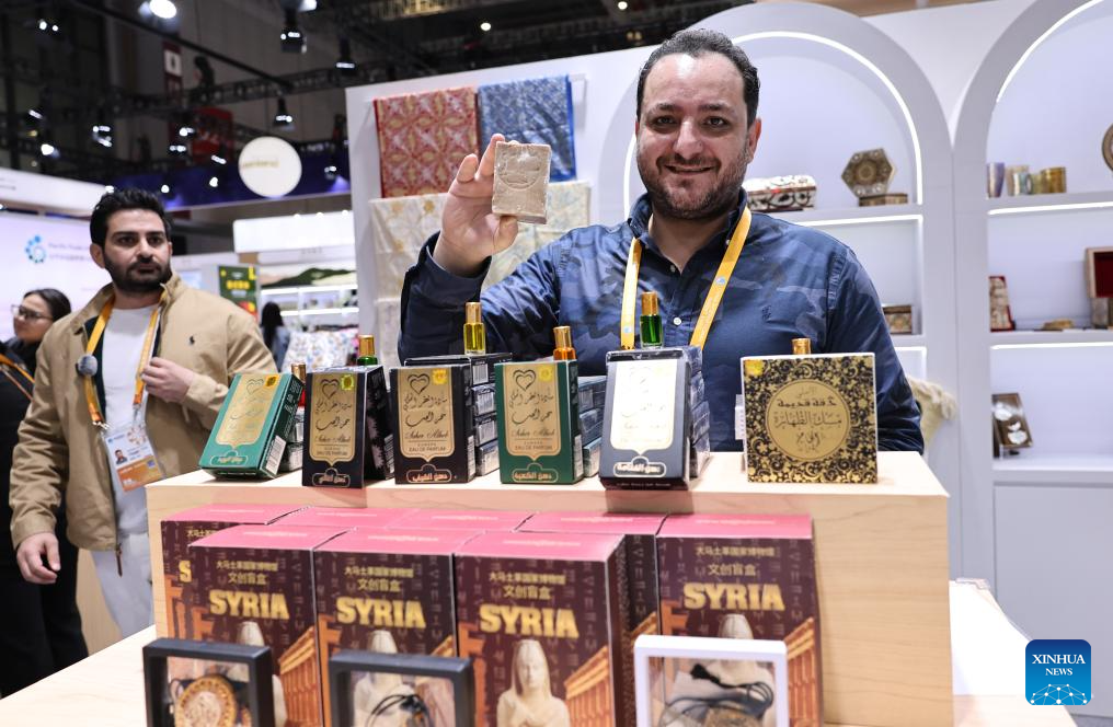 An exhibitor shows soaps from Syria at the Consumer Goods exhibition area of the eighth China International Import Expo (CIIE) in east China's Shanghai, Nov. 7, 2025. The eighth CIIE opened here on Wednesday. Enterprises from a total of 123 Belt and Road partner countries participated in this year's CIIE, increasing by 23.1 percent year on year. (Xinhua/Fang Zhe)