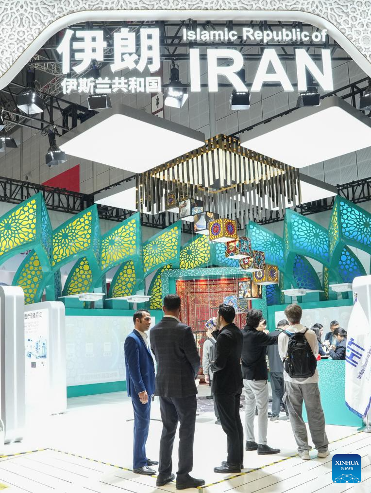 People communicate with each other at the pavilion of Iran during the eighth China International Import Expo (CIIE) in east China's Shanghai, Nov. 7, 2025. The eighth CIIE opened here on Wednesday. Enterprises from a total of 123 Belt and Road partner countries participated in this year's CIIE, increasing by 23.1 percent year on year. (Xinhua/Ren Pengfei)