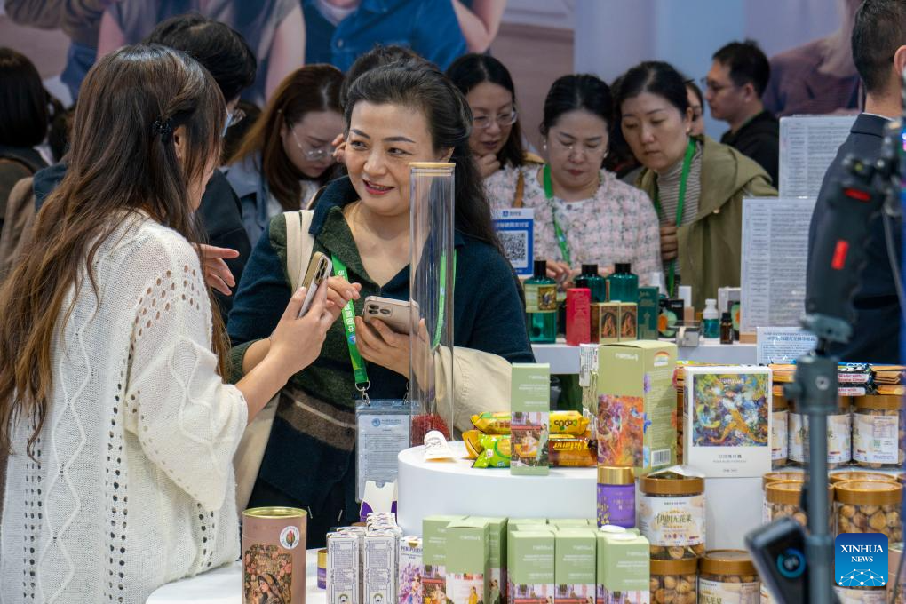 A visitor learns about rose products from Iran at the Consumer Goods exhibition area of the eighth China International Import Expo (CIIE) in east China's Shanghai, Nov. 7, 2025. The eighth CIIE opened here on Wednesday. Enterprises from a total of 123 Belt and Road partner countries participated in this year's CIIE, increasing by 23.1 percent year on year. (Xinhua/Ding He)