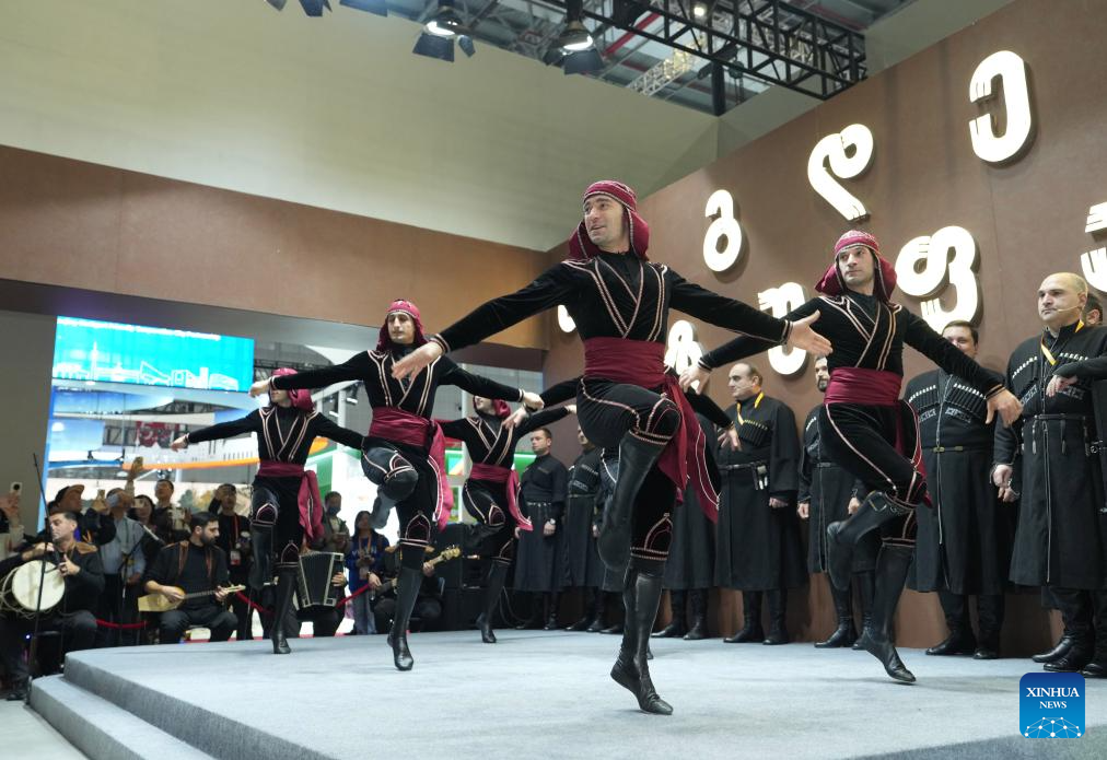 Staff members perform at the pavilion of Georgia during the eighth China International Import Expo (CIIE) in east China's Shanghai, Nov. 7, 2025. The eighth CIIE opened here on Wednesday. Enterprises from a total of 123 Belt and Road partner countries participated in this year's CIIE, increasing by 23.1 percent year on year. (Xinhua/Ren Pengfei)