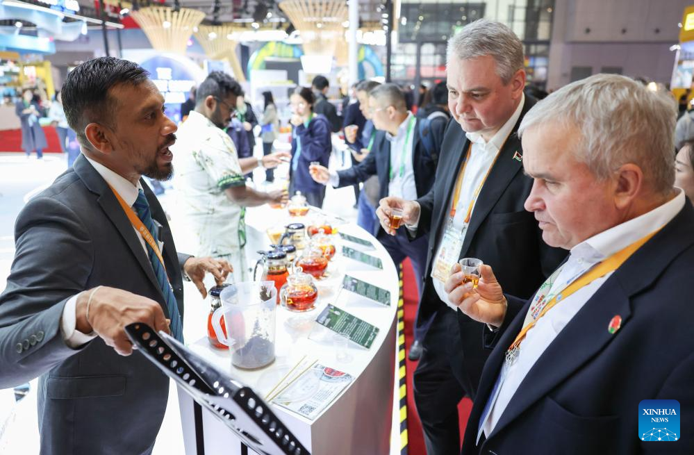 An exhibitor (1st L) promotes Ceylon black tea at the Sri Lanka Pavilion during the eighth China International Import Expo (CIIE) in east China's Shanghai, Nov. 7, 2025. The eighth CIIE opened here on Wednesday. Enterprises from a total of 123 Belt and Road partner countries participated in this year's CIIE, increasing by 23.1 percent year on year. (Xinhua/Meng Chenguang)