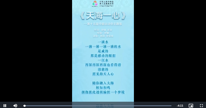 十五运会开幕式总导演郎昆介绍,《天海一心》由国家一级作曲、十五运会开幕式音乐总设计舒楠主导创作,将由周深和单依纯两位歌手在9日晚举行的十五运会开幕式上正式唱响。