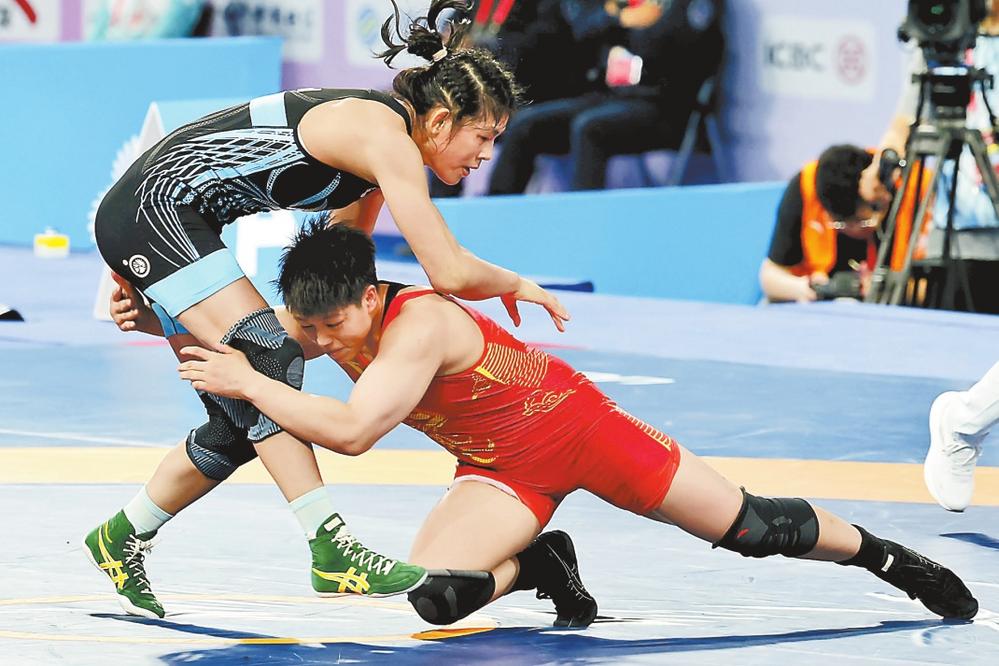 云南选手龙佳(红方)在十五运会女子自由式摔跤68公斤级比赛中。