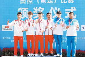 云南选手张俊(左三)在颁奖台上。 云南日报记者周灿摄