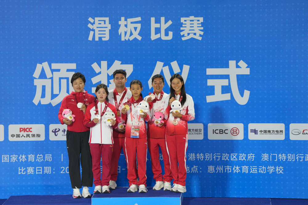 11月11日,第十五届全国运动会滑板项目女子碗池赛决赛在广东惠州举行。冠军广东队选手邹明珂(右三)、亚军山东队选手孟令妍(左二)、季军广东队选手郑好好(右一)和教练在颁奖仪式上合影。新华社记者 刘坤 摄