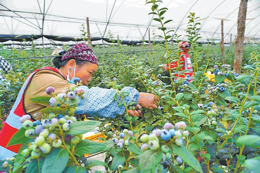 村民采摘蓝莓。