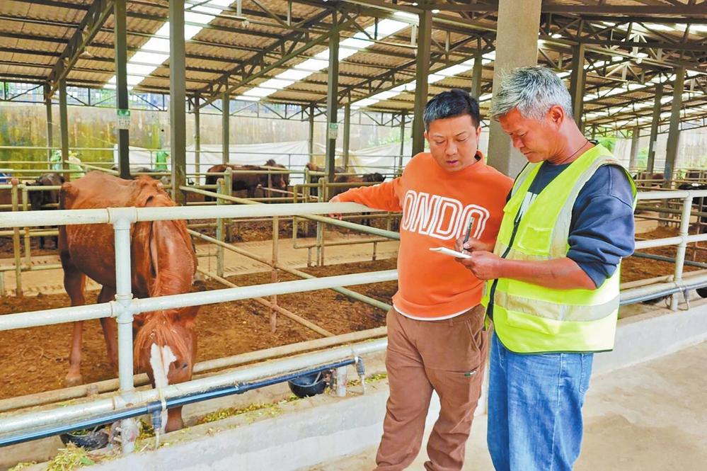 临翔区农业农村局畜牧兽医技术人员到蚂蚁堆乡养牛基地检查防疫情况。 云南日报记者 李春林 摄