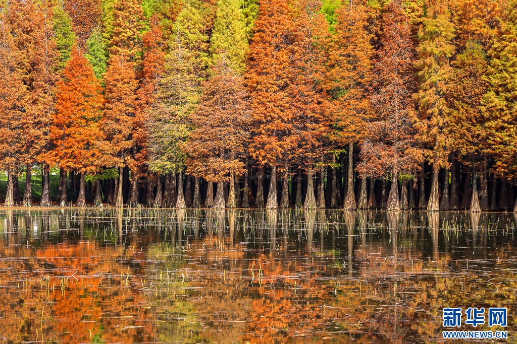 入冬后的昆明海洪湿地迎来了别样景致,水杉林褪去翠绿,换上红黄交织的“冬装”,与碧水相互映衬,色彩斑斓如油画。