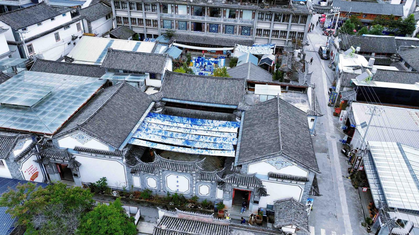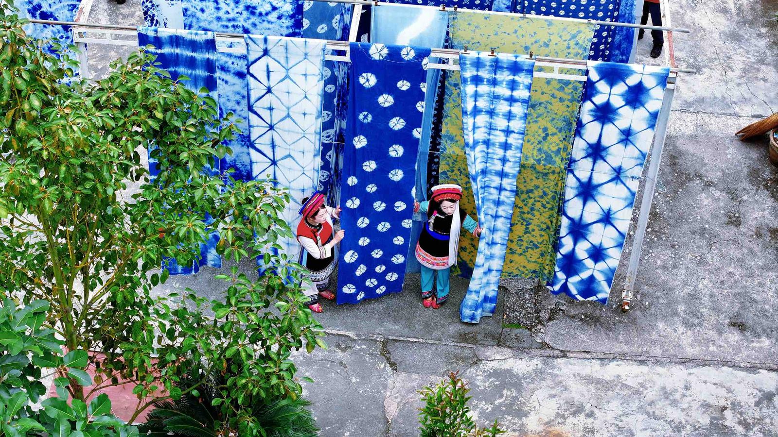 白族扎染技艺距今已有上千年历史,被誉为“布上的青花瓷”,以板蓝根为主要染料,通过绘图、制版、印花、扎花、染色、漂洗、拆花、晾晒等十余道工序制作而成。2006年,白族扎染被列入国家级非物质文化遗产名录。