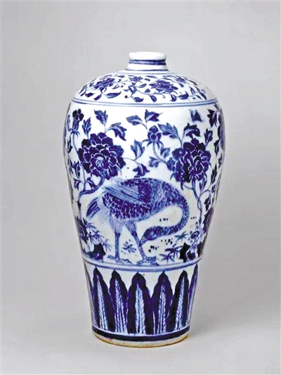 明代正统青花孔雀牡丹图 梅瓶 (1986年耿宝昌先生 捐献给故宫博物院收藏)