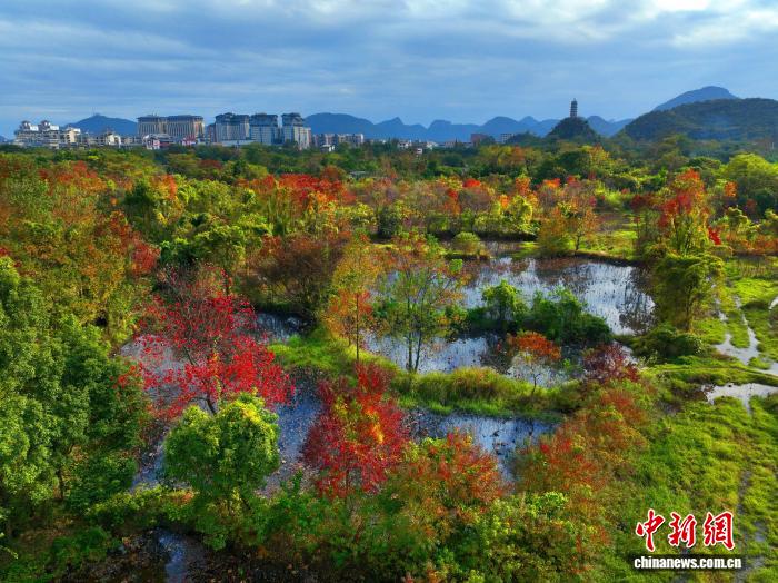 图为桂林市区琴潭湿地的乌桕美景。(无人机照片)李腾钊 摄