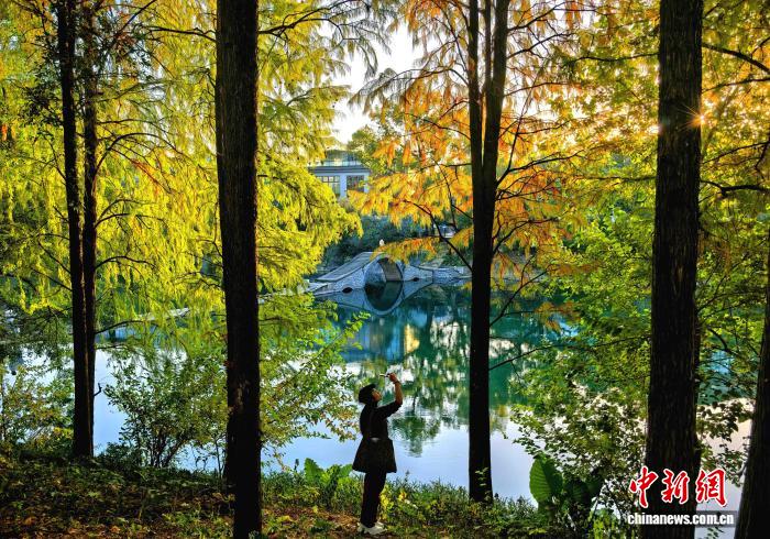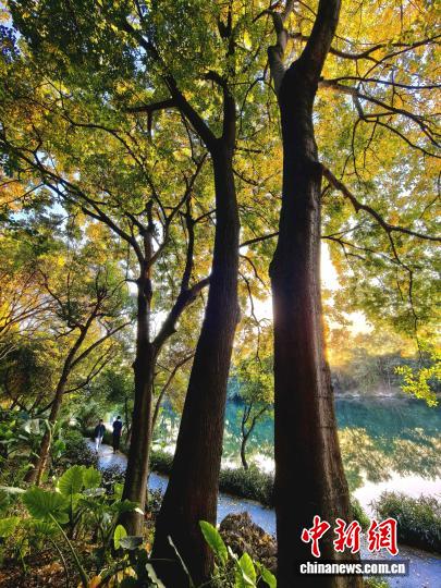 图为桂林市榕湖边上的银杏和榔榆在夕阳映照下美不胜收。李腾钊 摄