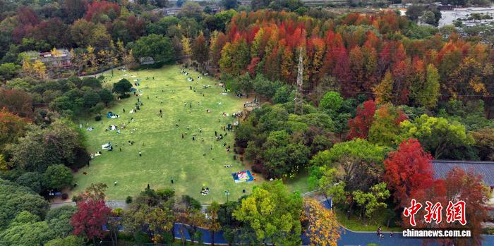 图为桂林园林植物园的枫香林吸引众多市民在林边游憩。(无人机照片)李腾钊 摄