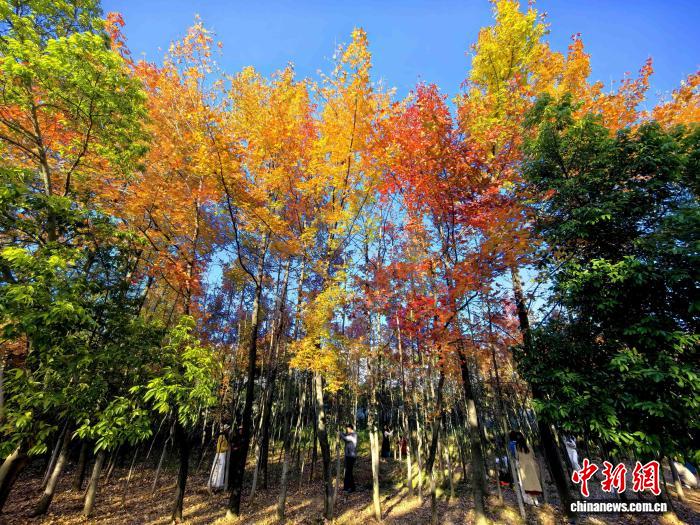 图为桂磨路边的枫香林成为市民游客的打卡地。李腾钊 摄