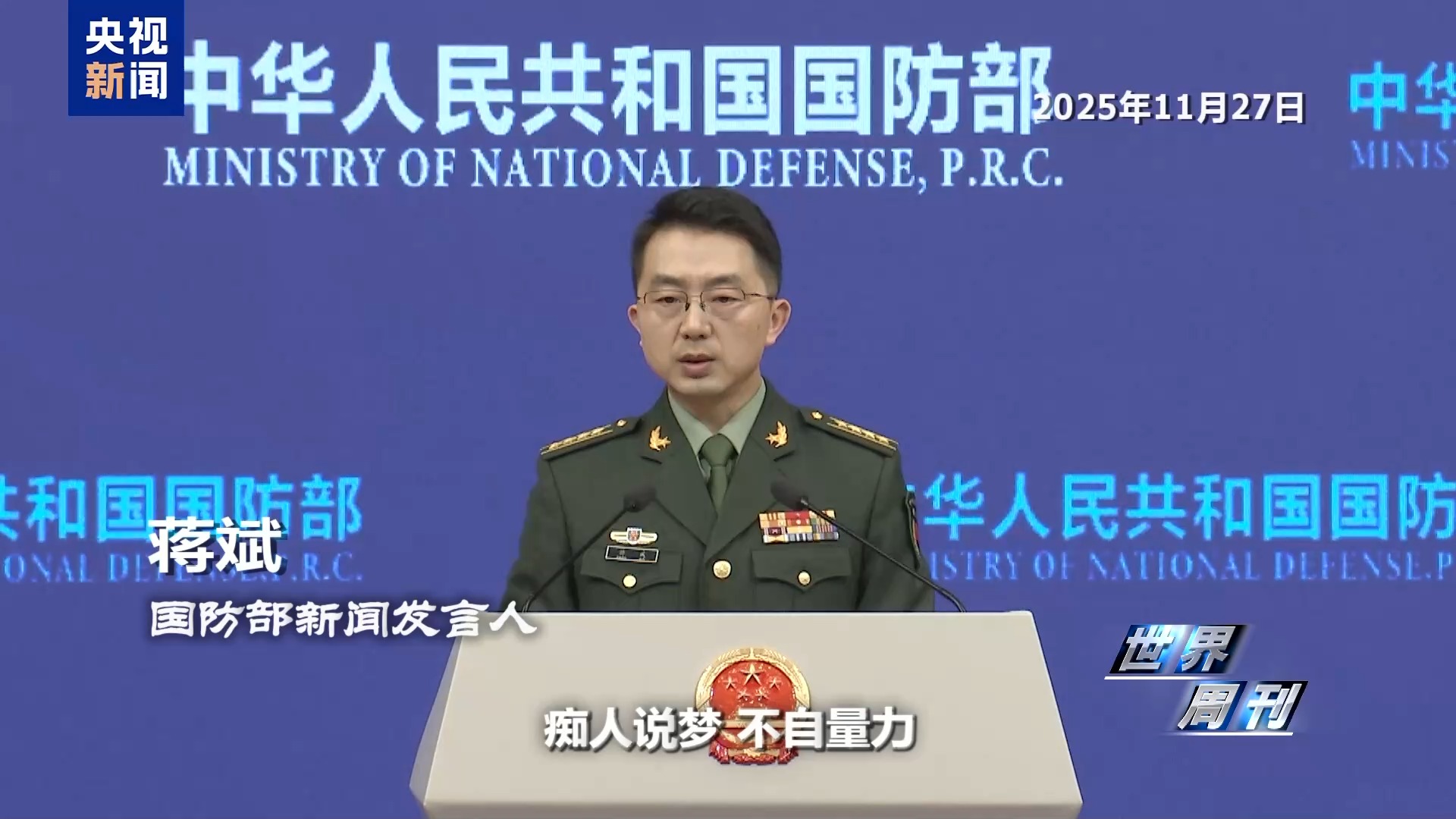 国防部新闻发言人 蒋斌:对于这样的言论,我有一句话回应:痴人说梦,不自量力。