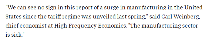 文章指出,美国政府曾辩称,加征关税是保护美国国内制造业的必要之举,但经济学家则认为,由于包括劳动力短缺在内的结构性问题,美国制造业已无法恢复昔日辉煌。文章援引高频经济咨询公司首席经济学家卡尔·温伯格(Carl Weinberg)的话表示,“从(ISM)这份报告中,我没有看到自关税政策出台以来,美国制造业出现任何增长的迹象,美国制造业已经病了。”