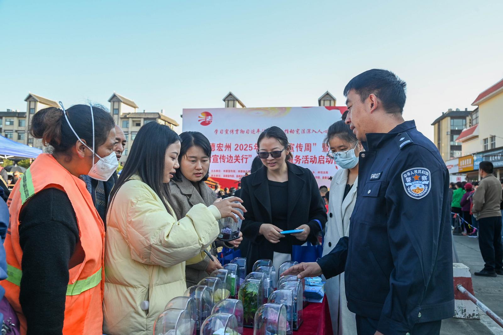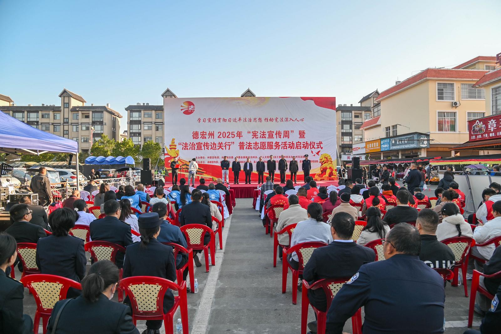 12月2日上午,德宏州2025年“宪法宣传周”暨“法治宣传边关行”普法志愿服务活动启动仪式在陇川县章丰农贸市场举行。德宏州、陇川县相关领导出席仪式,与来自各普法成员单位的工作人员、村(居)法律明白人、志愿者及周边群众共赴这场“法治盛宴”。
