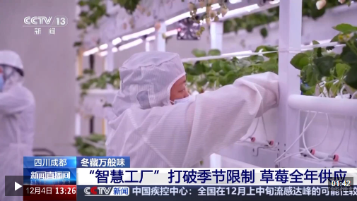 四川的冬草莓采摘时间一般是从11月持续至次年4月。但是在成都温江的智慧“草莓工厂”,却打破了这个限制,365天都可以采摘,年产量是传统种植的三四十倍。
