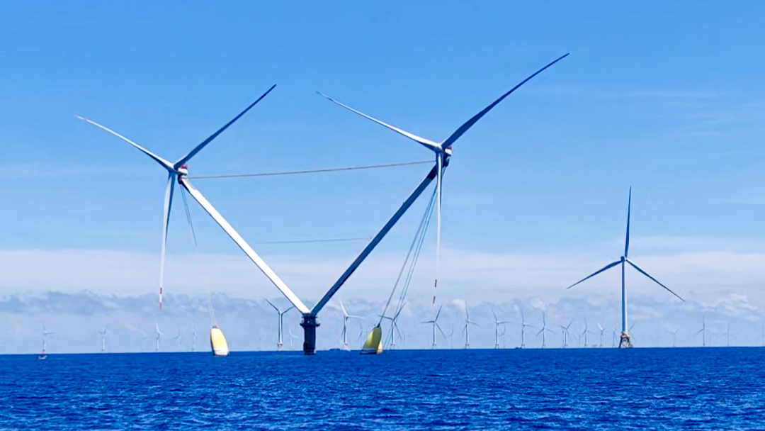 “明阳天成号”漂浮式风电平台和风电机组屹立在海面之上