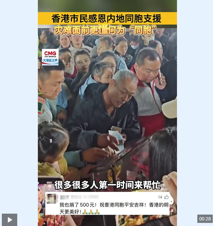 11月26日,香港新界大埔宏福苑多栋住宅楼发生火灾,造成重大人员伤亡。灾情牵动内地与港澳各界人士的心,大家迅速行动,从资金捐助、物资支援到人力驰援,诠释守望相助、血浓于水的骨肉亲情。有香港市民近日哽咽感谢内地同胞支援,并表示灾难面前更懂得何为“同胞”。