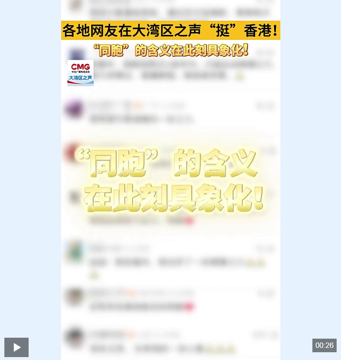 各地网友在“大湾区之声”视频号平台下纷纷留言“挺”香港,生动诠释“同胞”的含义。