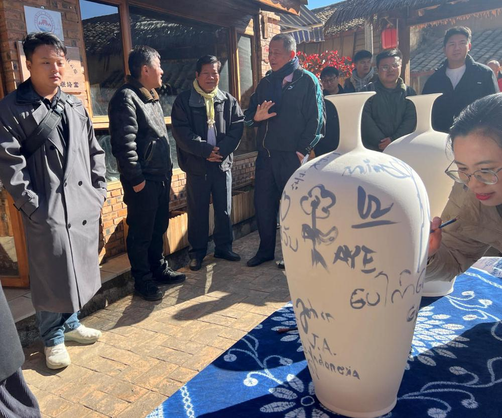各国媒体人在曲靖潦浒村了解陶艺制作。