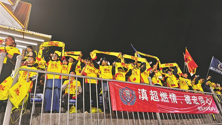 一抹亮眼的黄色在赛场看台绽放光彩,这是德宏球迷自发组建的助威方阵。他们保持文明观赛的良好风貌,持续为家乡德宏队注入昂扬斗志。不同于官方组织的统筹安排,这些球迷团体源于本土球迷的共同热爱,自发相聚、携手助威,用一声声呐喊助威表达对家乡球队的深情厚谊。在球迷心中,观赛从不只是静静旁观,他们精心编写助威口号、默契配合把控呐喊节奏、亲手制作饱含心意的应援物件,还以满腔热忱为球队创作专属歌曲。每一份细致筹备,都是德宏足球最坚实的后盾与最暖心的支撑。