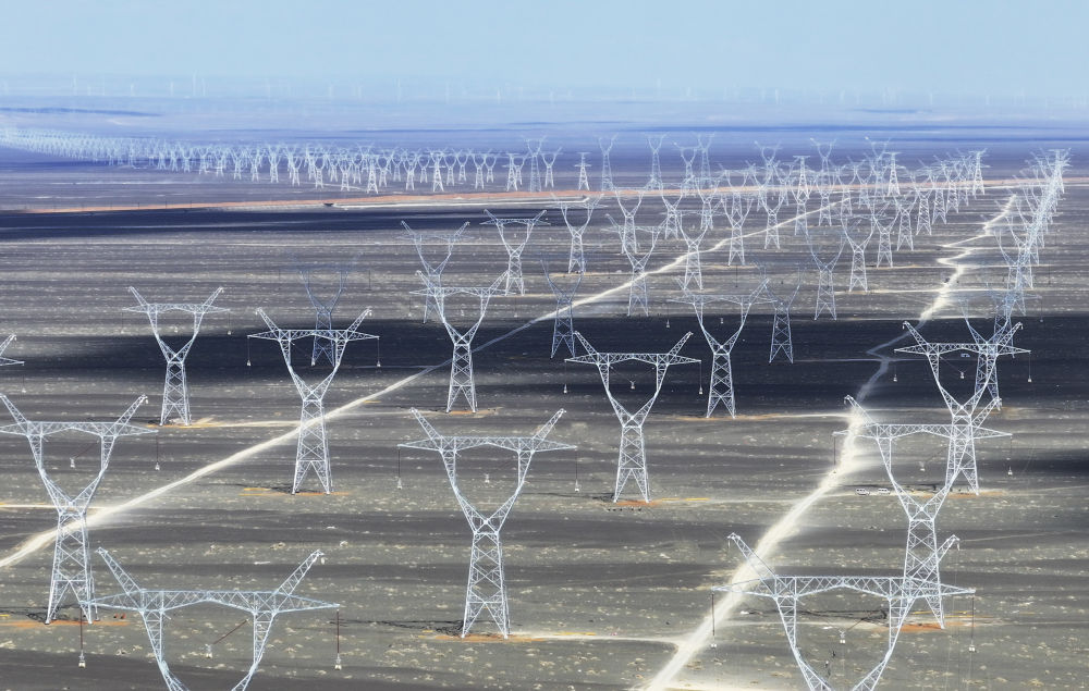 这是2025年4月24日在新疆哈密地区三塘湖镇附近拍摄的“疆电入渝”特高压工程(无人机照片)。新华社记者 王菲 摄