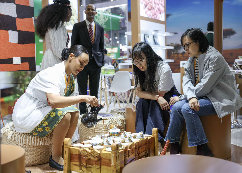 2025年11月7日,人们在第八届进博会国家展埃塞俄比亚馆品尝咖啡。新华社记者 孟晨光 摄