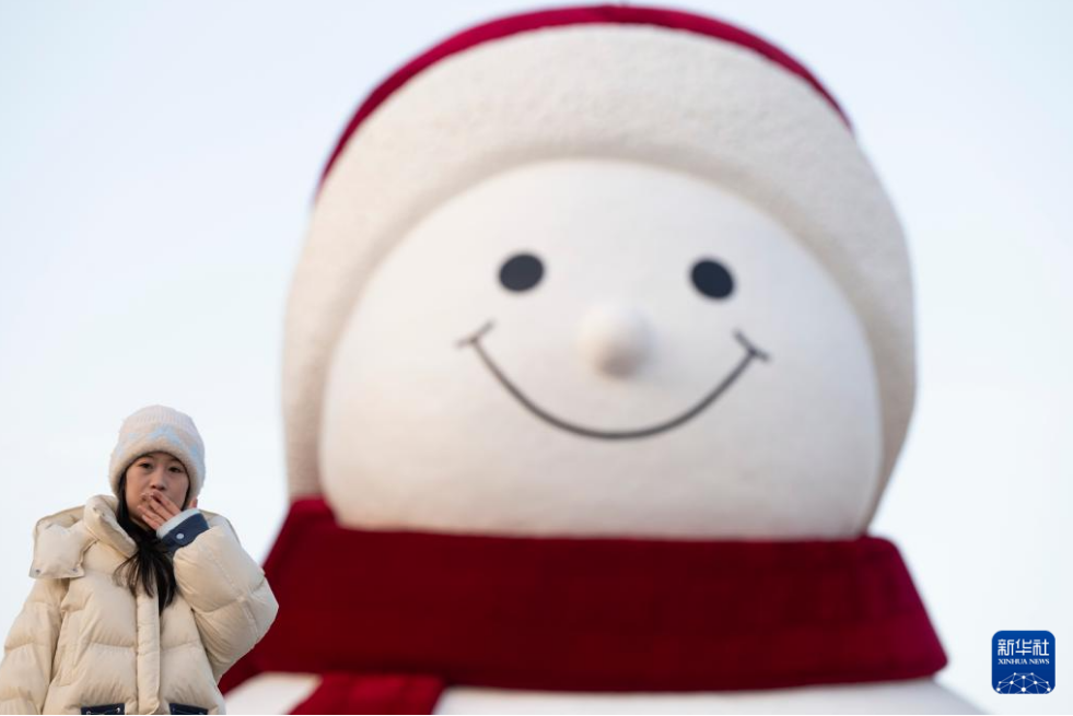 12月15日,游客在哈尔滨市群力音乐公园大雪人前合影。